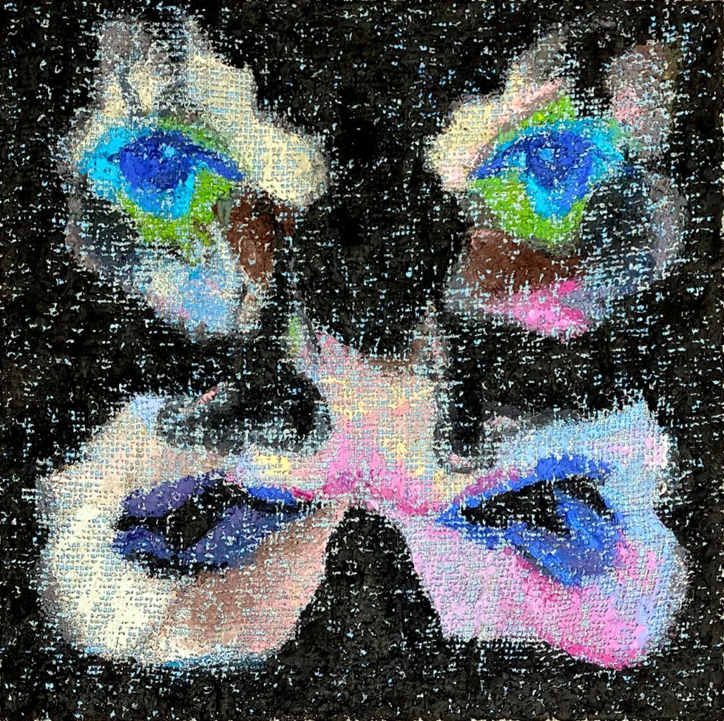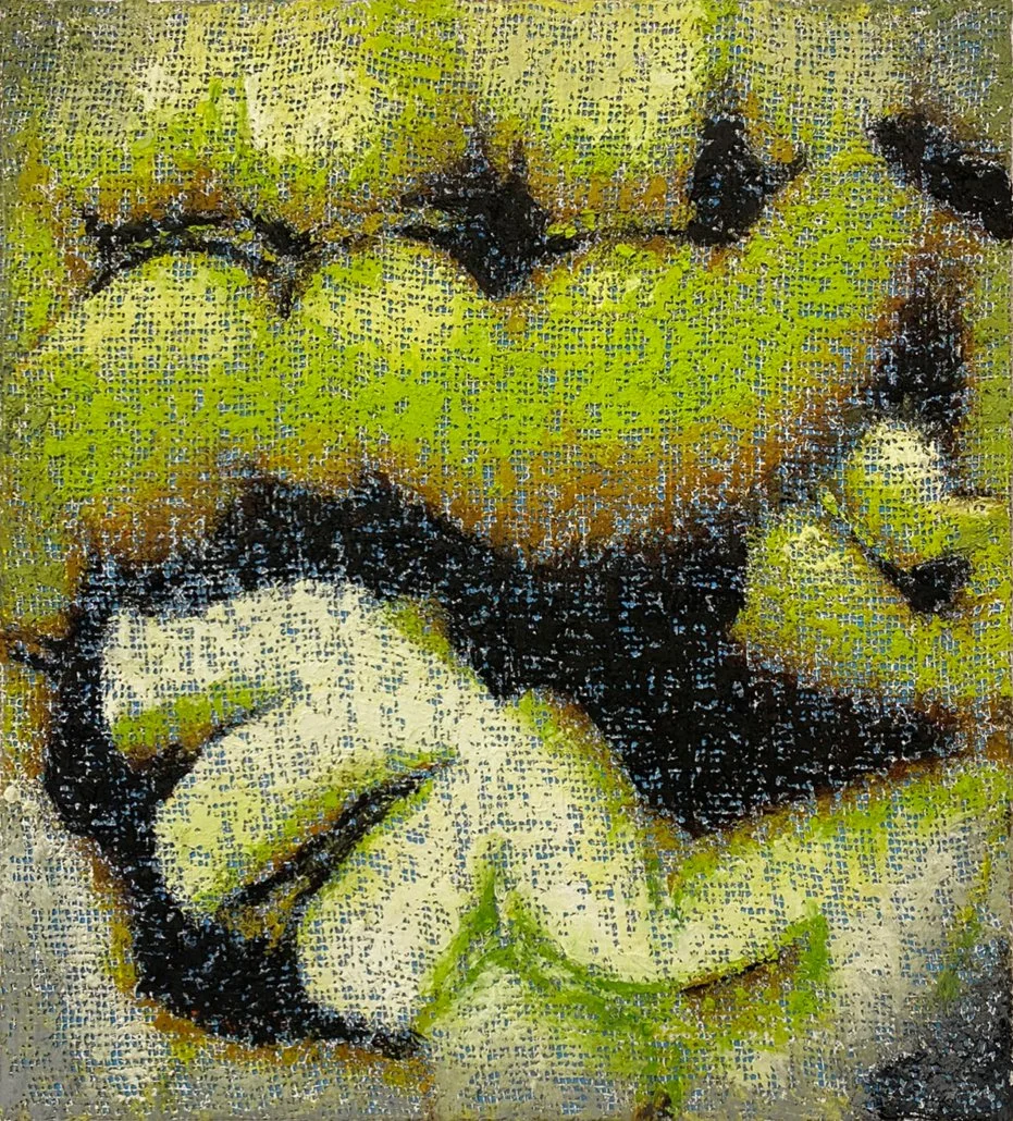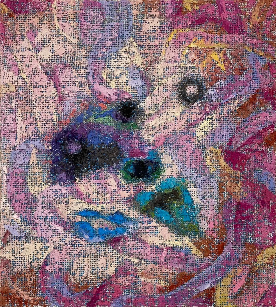 Charakteristisch für die Werke ist eine rasterartige Struktur, die sich aus dem Zusammenspiel von Farbauftrag und Malgrund ergibt. In unterschiedlich starker Deckkraft wird die Ölfarbe mit dem Spachtel auf ein grobmaschiges Jutegewebe aufgetragen, wodurch die Beschaffenheit der Leinwand sichtbar bleibt und zum wesentlichen Bildbestandteil wird. Es entsteht pixelartig wirkende Struktur, die zwischen abstrakten Gebilden und schemenhaft oder deformiert erscheinenden menschlichen Figuren changieren. Die Werke beschäftigen sich mit dem Einfluss des Digitalen auf unser Erleben. Selbstdarstellung, Informationsdichte und Umgang mit Bildern, dieses Phänomen sowie unsere Verhaltensmuster in der digitalen Welt, werden hier angesprochen, und in das klassische Medium der Malerei übersetzt.