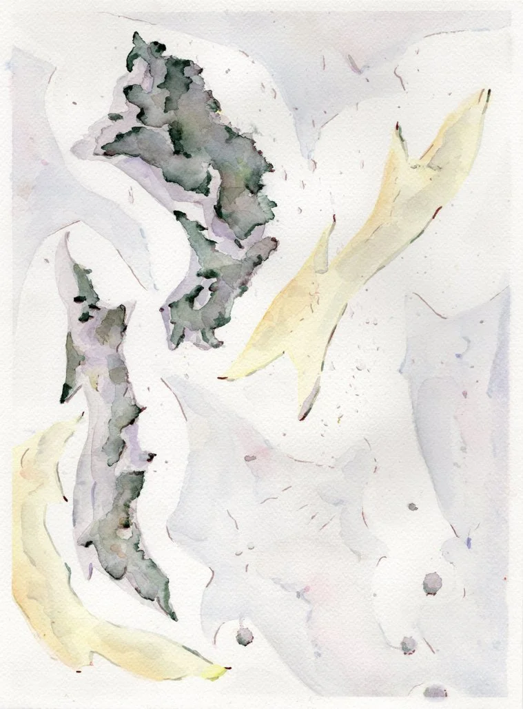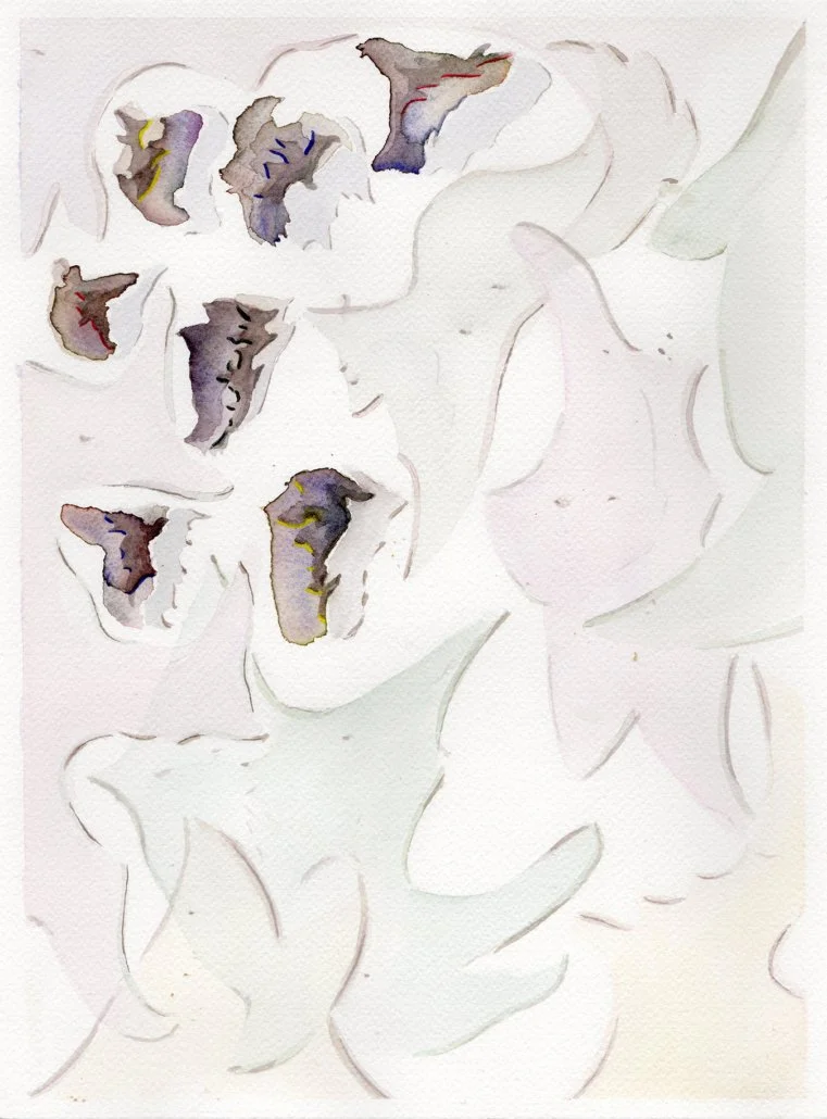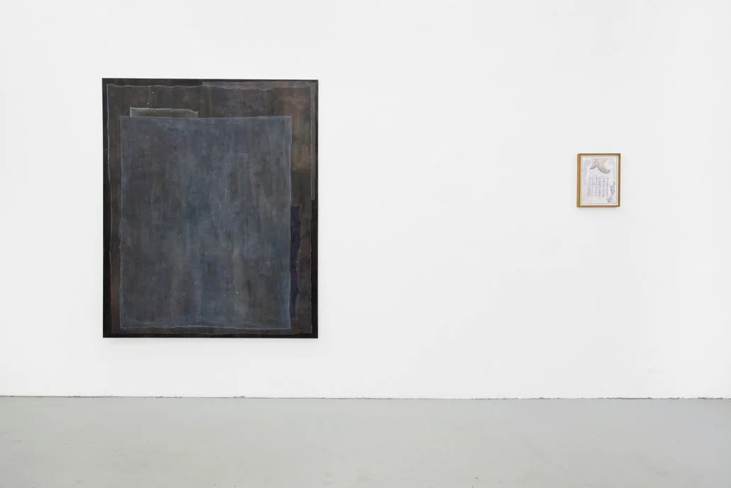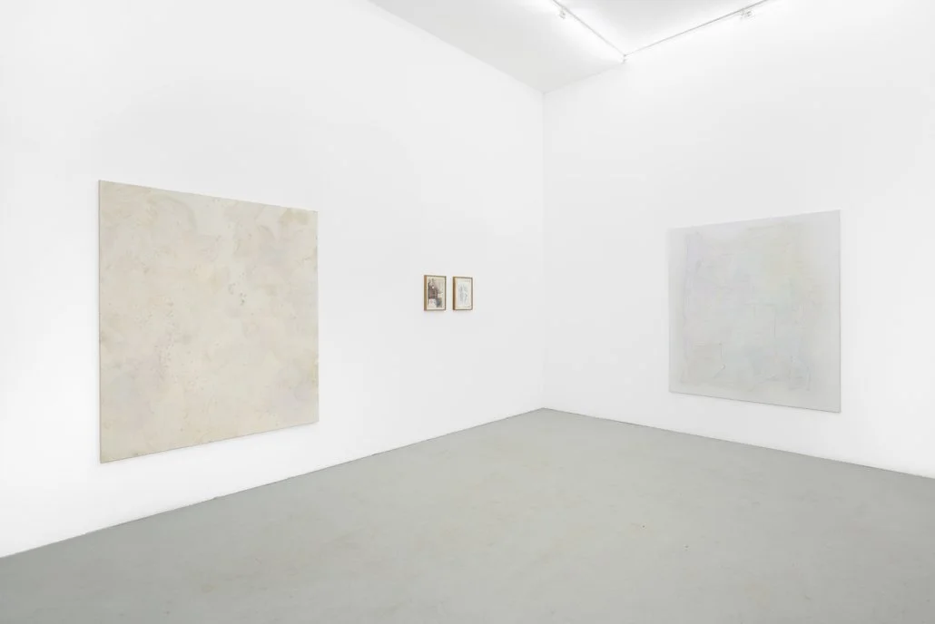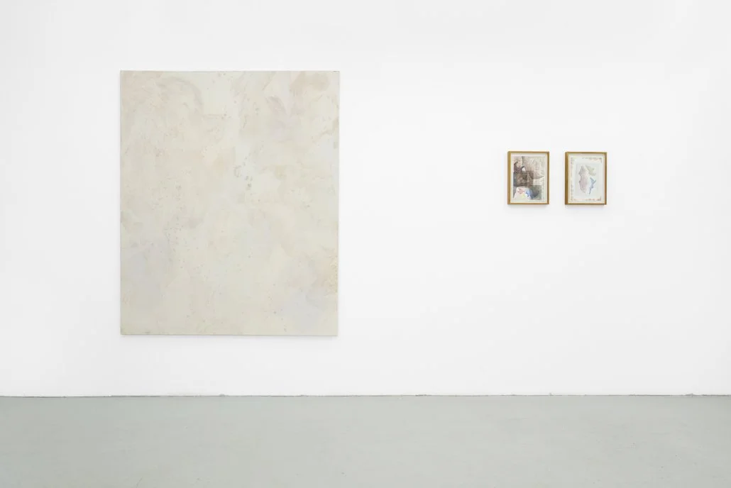 Der Dialog zwischen dem einzelnen Kunstwerk und dem:r Betrachter:in wird im Ausstellungskontext durch weitere Arbeiten ergänzt. Zwischen den großformatigen Malereien, aber auch den deutlich kleineren Aquarellen, die gleichberechtigt im Ausstellungsraum hängen, ergeben sich neue Beziehungsverhältnisse, die auf die Auseinandersetzung mit den Bildern zurückstrahlen. Die Aquarelle ergänzen die Leinwände nicht nur formal in Farben, Formen und Bildstrukturen, oder das Wideraufgreifen von Raster- bzw. Linienmustern, sondern auch inhaltlich: Die Limitierungen, die sich Myriam Mayer in ihrer Malerei setzt, sind im Aquarell schon durch seine Materialität festgelegt; ein Pinselstrich lässt sich kaum wieder unsichtbar machen und zu viele Schichten würden das Papier verletzen. Obwohl sie eigenständige und gleichberechtigte Arbeiten sind, unterstützen sie die Auseinandersetzung mit den Leinwänden, deren Malerei sich häufig an der Grenze des Wahrnehmbaren befindet: Eine Form, die dort wie ein unbeabsichtigter Fleck erscheint, taucht im Aquarell wieder auf; fast unsichtbare Farbnuancen sind auf dem Papier stärker ausgeprägt und Überschneidungen organisch geformter Linien lassen sich im kleinen Format leichter erfassen. Diese Gegenüberstellung schult das genaue Hinsehen, um die feinen Nuancen in der Bildwelt von Myriam Mayer zu erkennen.